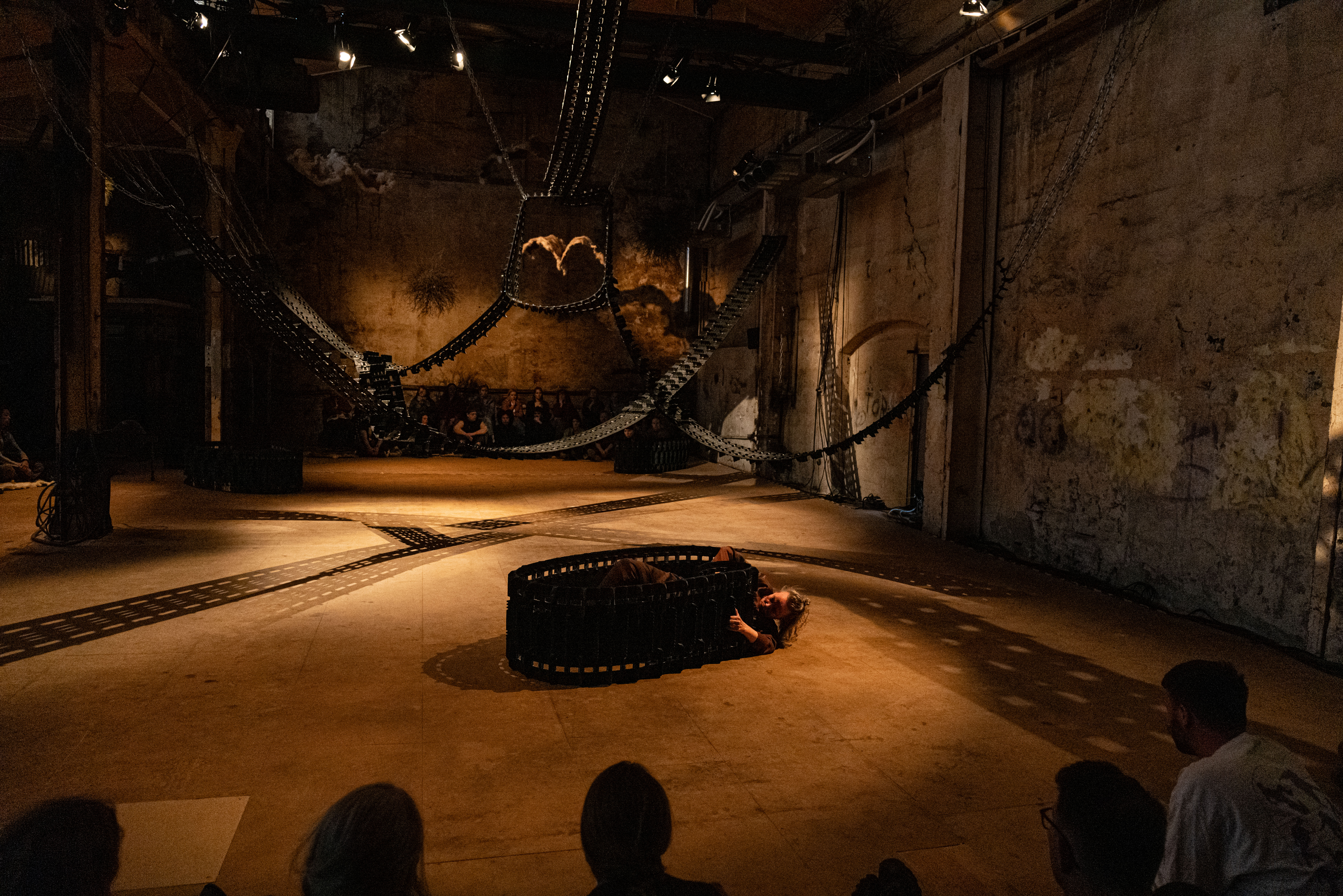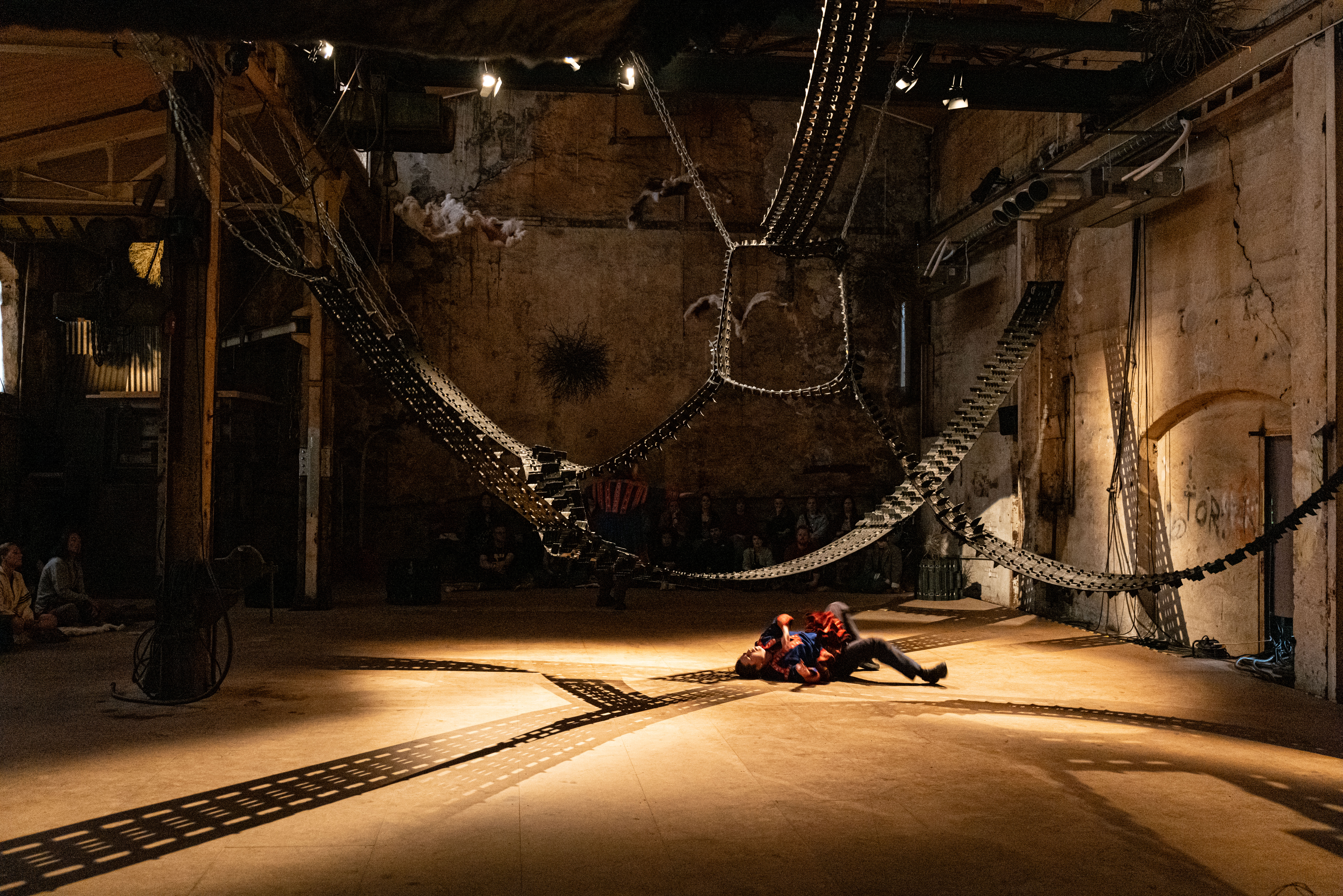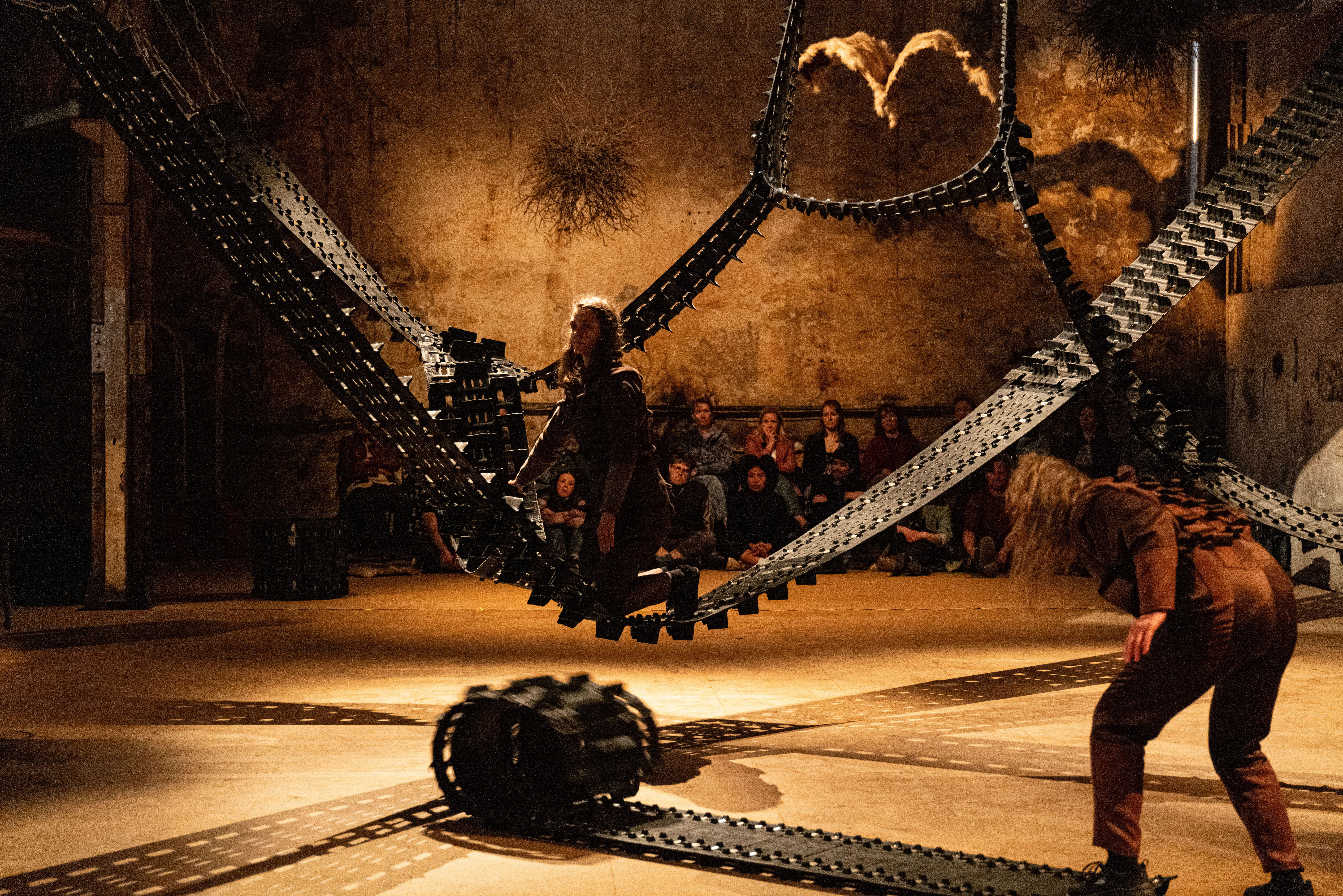 Snowmobile tracks are installed from floor to ceiling. Swaying through the space like the northern lights, like paths, like veins, like bridges or barriers. Floating objects of metal, leather, grass, and twigs. What are we looking at? A potent starry sky, a teeming cosmos, or a universe thrown off its natural course?
