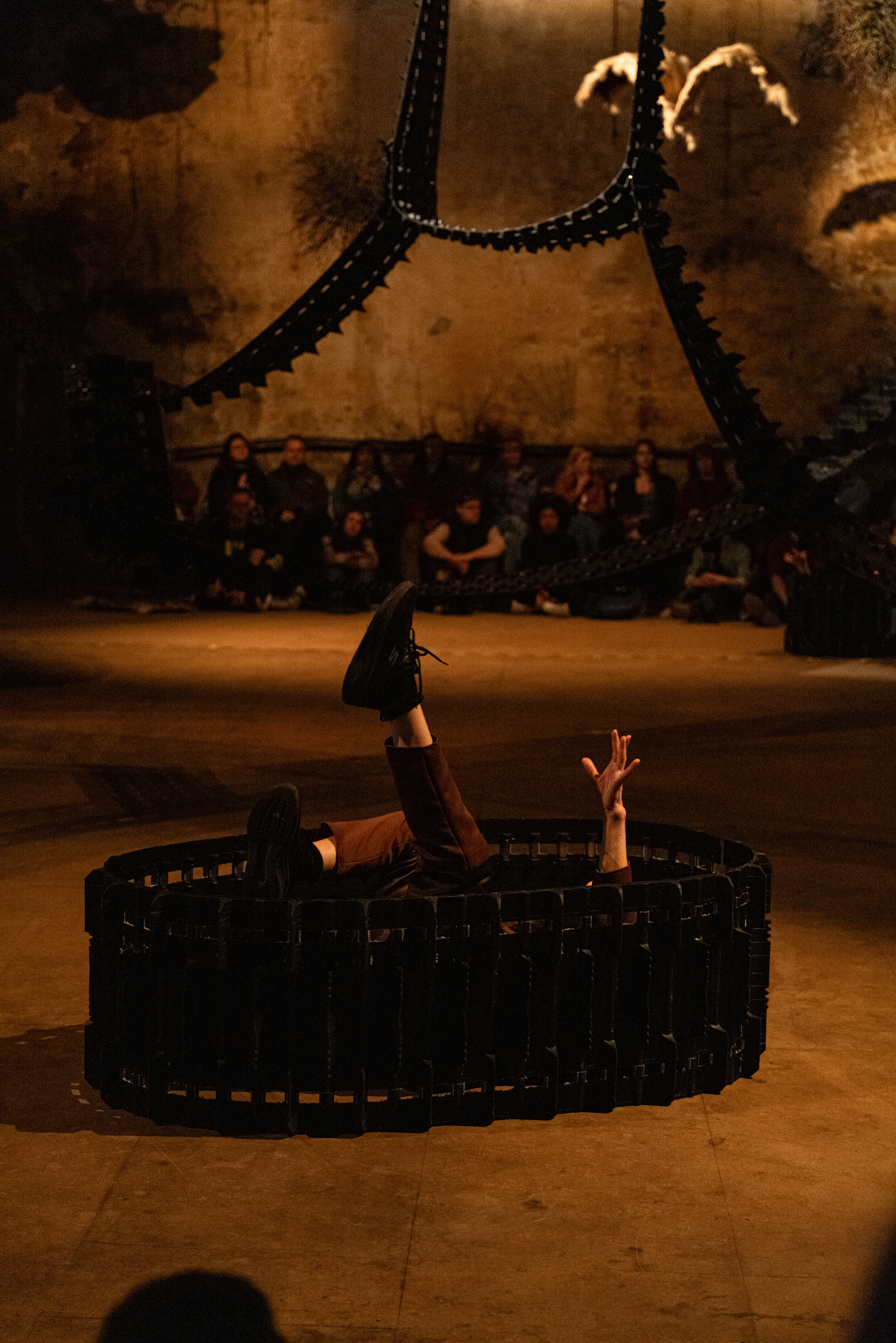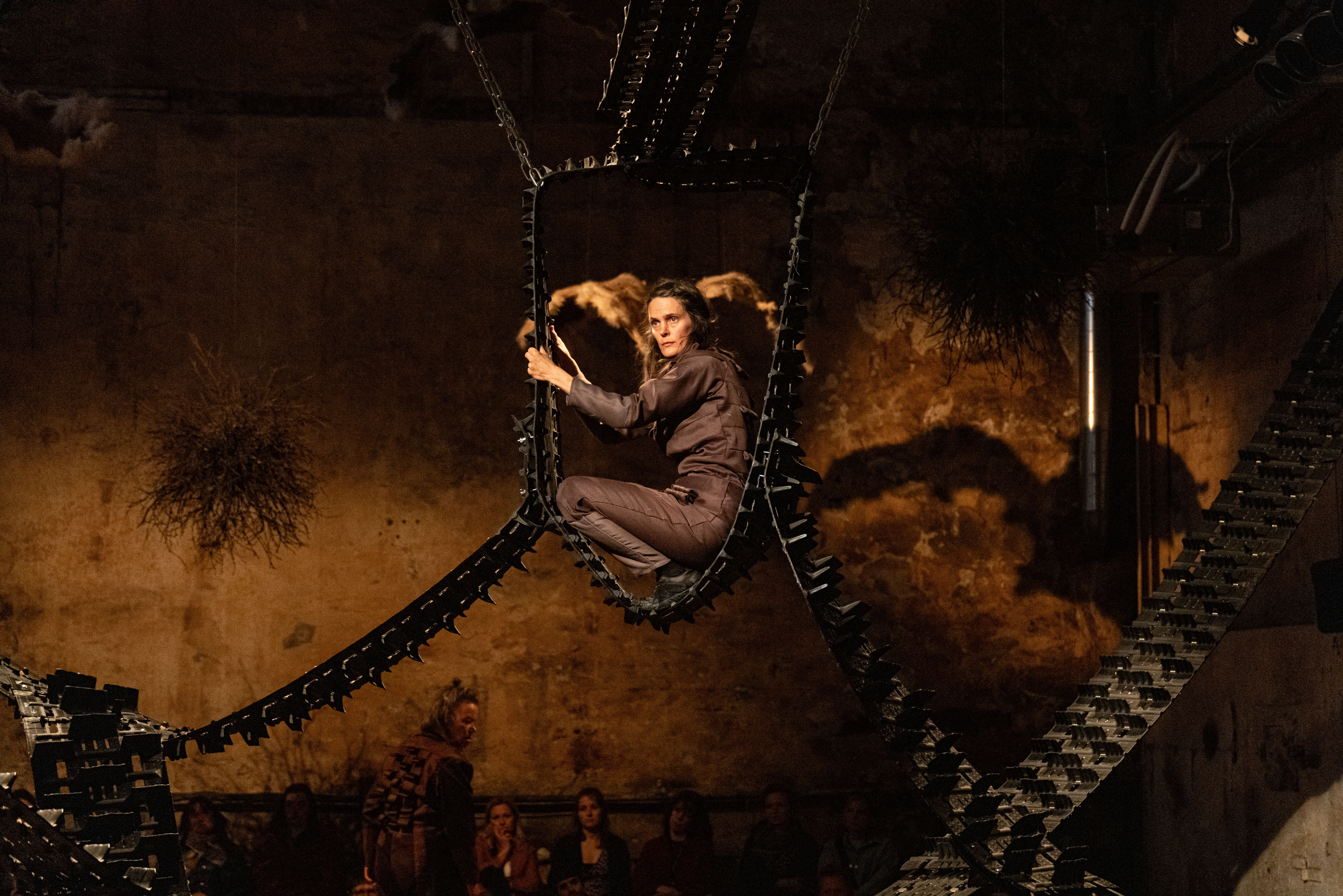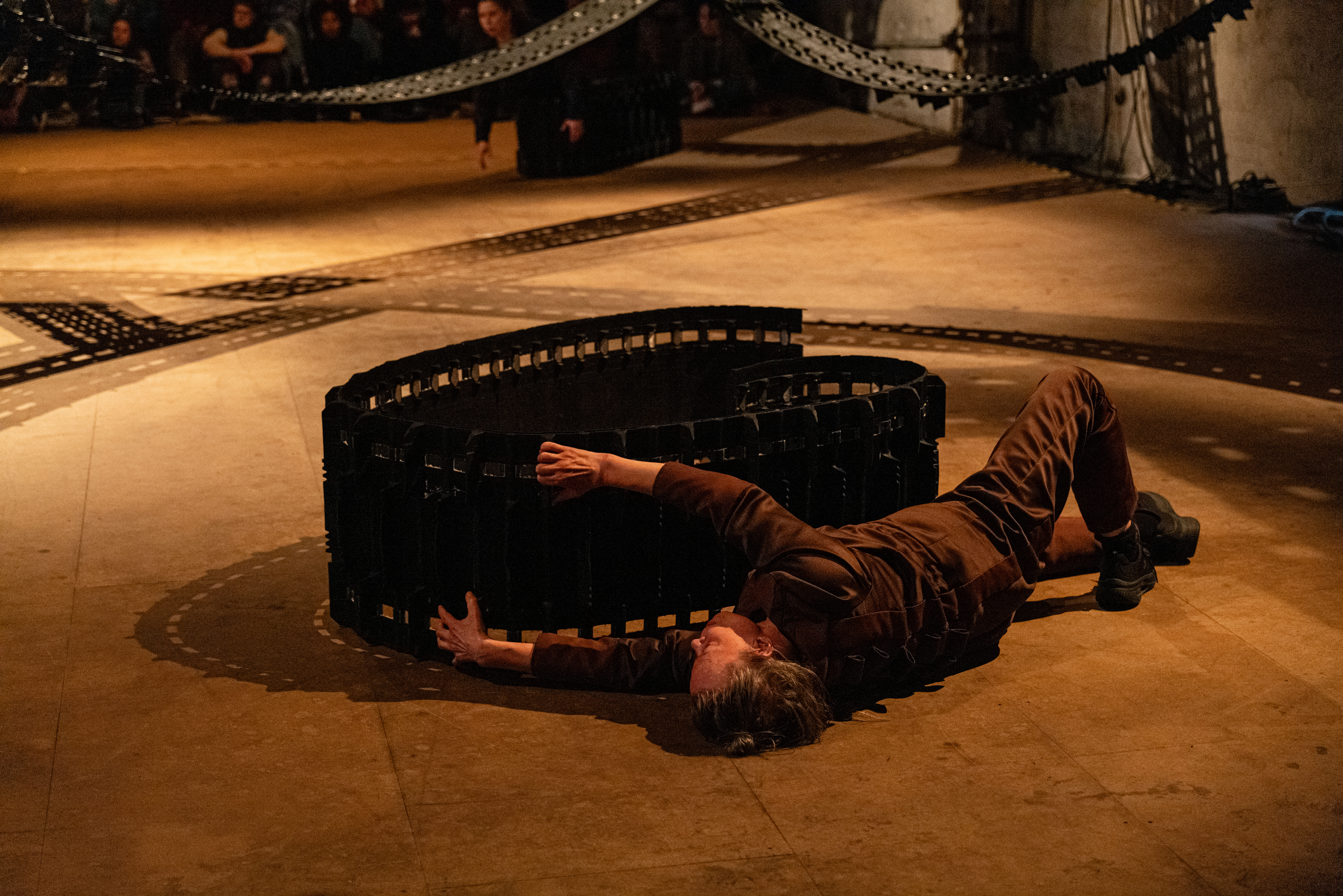 Snowmobile tracks are installed from floor to ceiling. Swaying through the space like the northern lights, like paths, like veins, like bridges or barriers. Floating objects of metal, leather, grass, and twigs. What are we looking at? A potent starry sky, a teeming cosmos, or a universe thrown off its natural course?