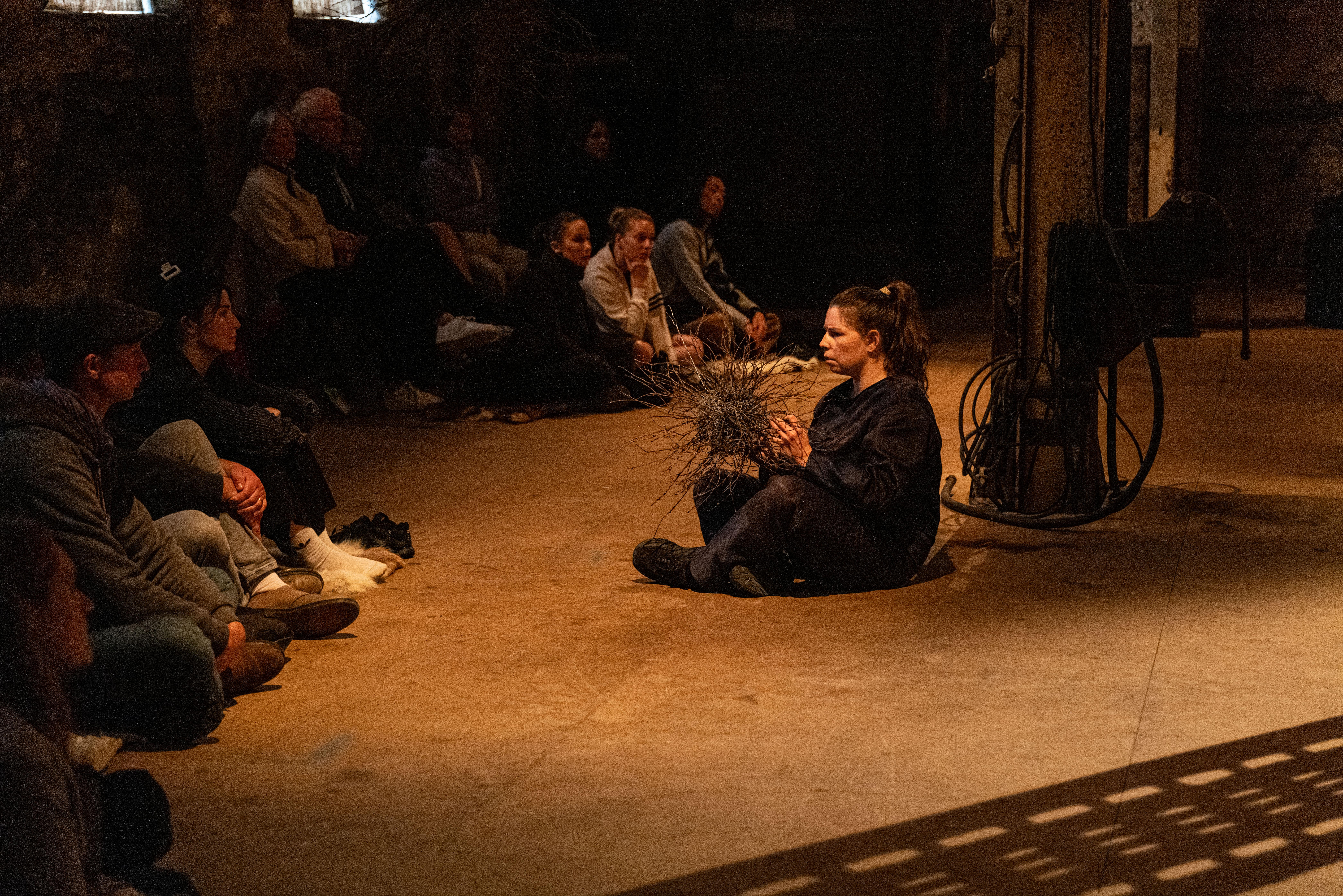 Sara describes this space of tension as an existential split between an outer life rooted in modern Western industriality and capitalism, and an inner logic grounded in Sámi philosophy and Indigenous science. This tension is explored through a performance that uses Indigenous science as its method. Within Indigenous science, “being alive” is understood as an inclusive definition: everything is seen as possessing energy and its own unique intelligence and creative process—not only obviously animated beings such as plants, animals, and microorganisms, but also stones, mountains, rivers, and places.