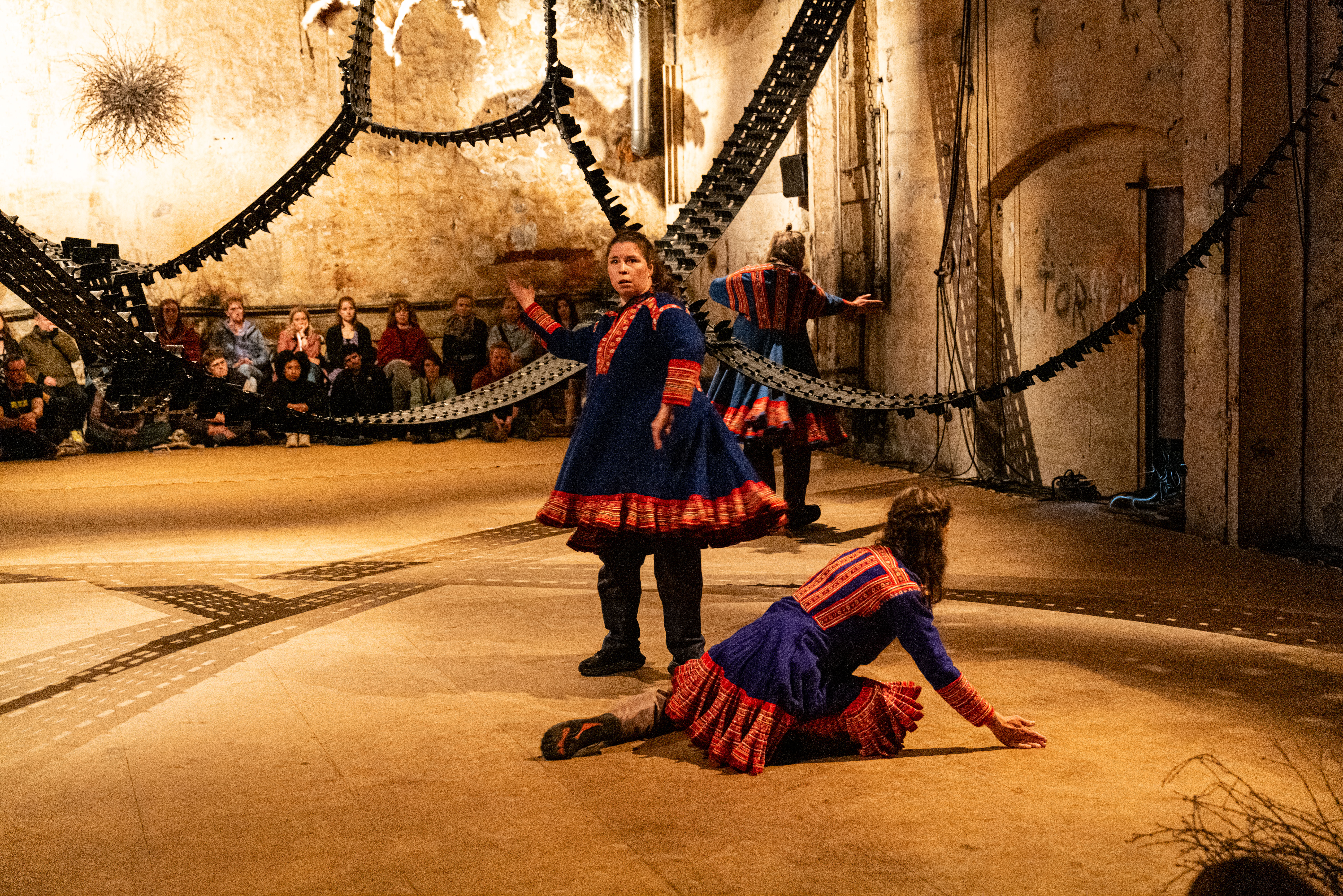 Artistic direction and visual art by Máret Ánne Sara. Movement and voice material by Anja Saiva Bongo Bjørnstad, Anitta Katriina Suikkari and Ina Dokmo. Performance by Anja Saiva Bongo Bjørnstad, Anitta Katriina Suikkari and Ina Dokmo. Choreography by Alexandra Wingate together with Maret Anne Sara. Sound design by Kristine Hansen. Costume by Line Maher. Production by Alexandra Wingate and co-produced by Festspillene.